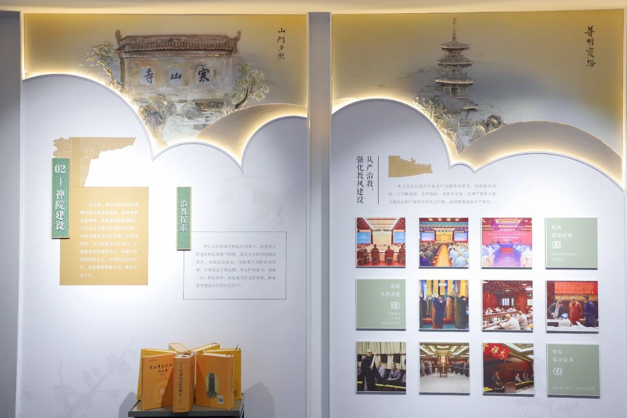 展示館分設(shè)四大單元,從多元維度描繪寒山寺佛教中國(guó)化的成果畫卷?!熬壠鹁怼绷⒆愕滋N(yùn),敘述古剎沿革。“和合卷”著眼當(dāng)代發(fā)展,將思想政治建設(shè)、教風(fēng)建設(shè)、法治化建設(shè)一一道來,并展示出和合文化對(duì)構(gòu)建和諧社會(huì)的積極影響。“禪心卷”彰顯僧才培養(yǎng)、信眾引導(dǎo)的各項(xiàng)成果,以及寒山寺踐行文化興教、文化興寺理念的種種努力?!按壬凭怼敝v述寺院多年來的公益慈善活動(dòng),秉持佛教傳統(tǒng),以出世心做入世事,慈悲為懷,利樂有情,是人間佛教的立世擔(dān)當(dāng)。