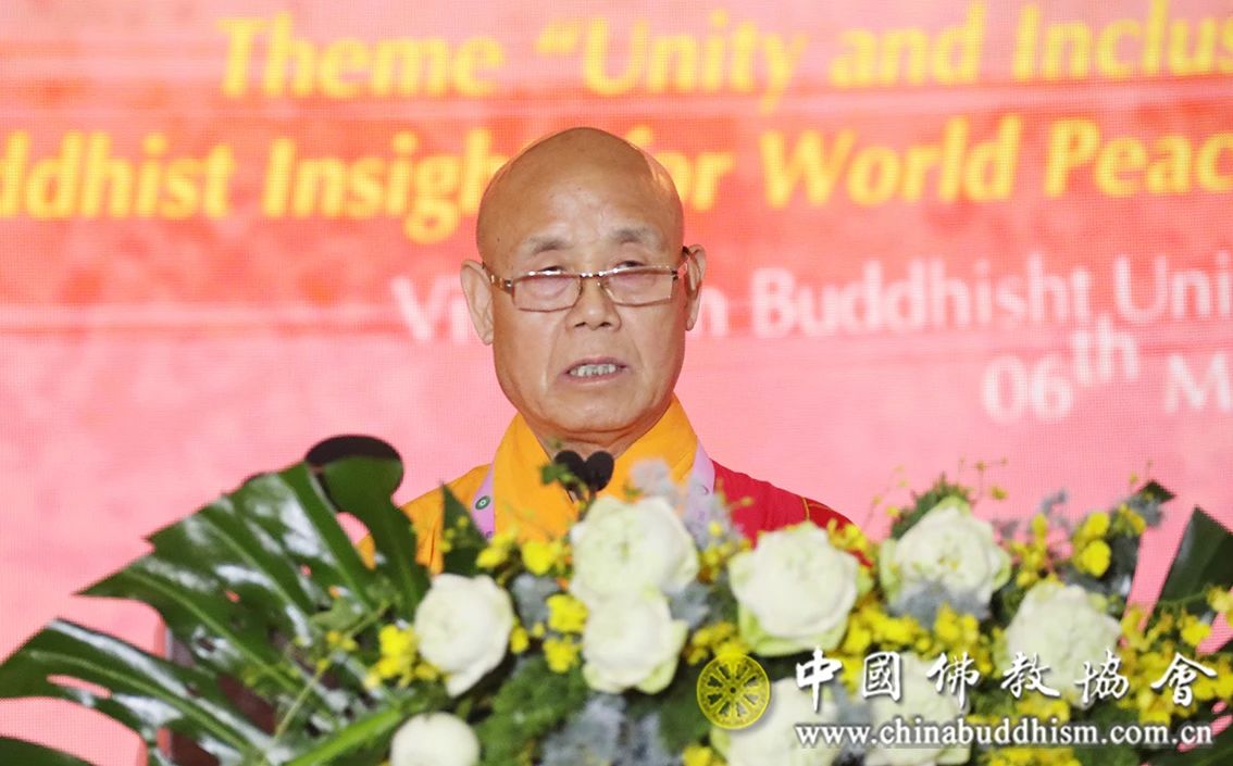演覺(jué)會(huì)長(zhǎng)倡議,世界各國(guó)佛教四眾弟子應(yīng)傳承傳統(tǒng)法誼,加強(qiáng)各國(guó)佛教界之間友好交流,以慶祝聯(lián)合國(guó)衛(wèi)塞節(jié)為契機(jī),不斷加強(qiáng)在佛教經(jīng)典闡釋、修行實(shí)踐、公益慈善、環(huán)境保護(hù)及人才培養(yǎng)等方面的務(wù)實(shí)合作;應(yīng)弘揚(yáng)慈悲和平教義,促進(jìn)各國(guó)人民心靈相通,充分發(fā)揮佛教文化紐帶、民間交流的作用,促進(jìn)各國(guó)人民彼此相知、相親,夯實(shí)國(guó)際和平共處、合作共贏的民心基礎(chǔ);應(yīng)踐行平等中道理念,推動(dòng)人類文明交流互鑒,以平等之心和中道智慧,積極參與國(guó)際宗教對(duì)話,促進(jìn)不同信仰、種族相互尊重包容、和諧共存,積極響應(yīng)習(xí)近平主席提出的全球文明倡議,推動(dòng)不同文明交流互鑒,促進(jìn)人類文明發(fā)展進(jìn)步。越南社會(huì)主義共和國(guó)主席梁強(qiáng),斯里蘭卡總統(tǒng)阿努拉·庫(kù)馬拉·迪薩納亞克,聯(lián)合國(guó)衛(wèi)塞節(jié)國(guó)際理事會(huì)主席梵智長(zhǎng)老,越南佛教教會(huì)咨議委員會(huì)法主智廣長(zhǎng)老、越南佛教教會(huì)中央執(zhí)行委員會(huì)主席善仁長(zhǎng)老等來(lái)自越南、老撾、緬甸、泰國(guó)、斯里蘭卡的佛教界代表人士和政要嘉賓分別在開(kāi)幕式上致辭。