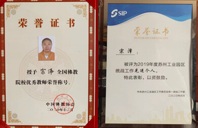 /全國(guó)佛教院校優(yōu)秀教師/蘇州工業(yè)園區(qū)統(tǒng)戰(zhàn)工作先進(jìn)個(gè)人2020年12月2日,中國(guó)佛教協(xié)會(huì)第十次代表大會(huì)在浙江寧波閉幕,在“第二屆全國(guó)佛教院校優(yōu)秀教師榮譽(yù)稱號(hào)授予儀式”上,江蘇佛學(xué)院寒山學(xué)院宗澤法師榮獲“全國(guó)佛教院校優(yōu)秀教師”稱號(hào)。
