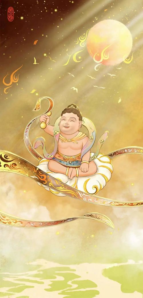 太子說后,天空直瀉下兩條銀鏈似的凈水,一是溫暖的,一是清涼的,太子沐浴以后,身心感到加倍爽快??罩衼砹撕芏嗟奶焱鹾丸笊瘢焱跖e起琉璃床的四足,梵神恭敬地捧著珍貴的傘蓋,無數(shù)天人都出現(xiàn)在空中,他們都來贊美這位現(xiàn)在的太子——未來的佛陀的降誕。