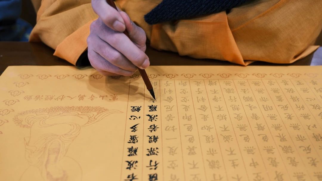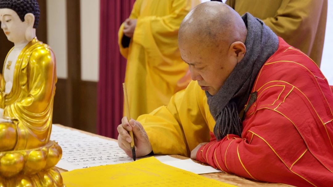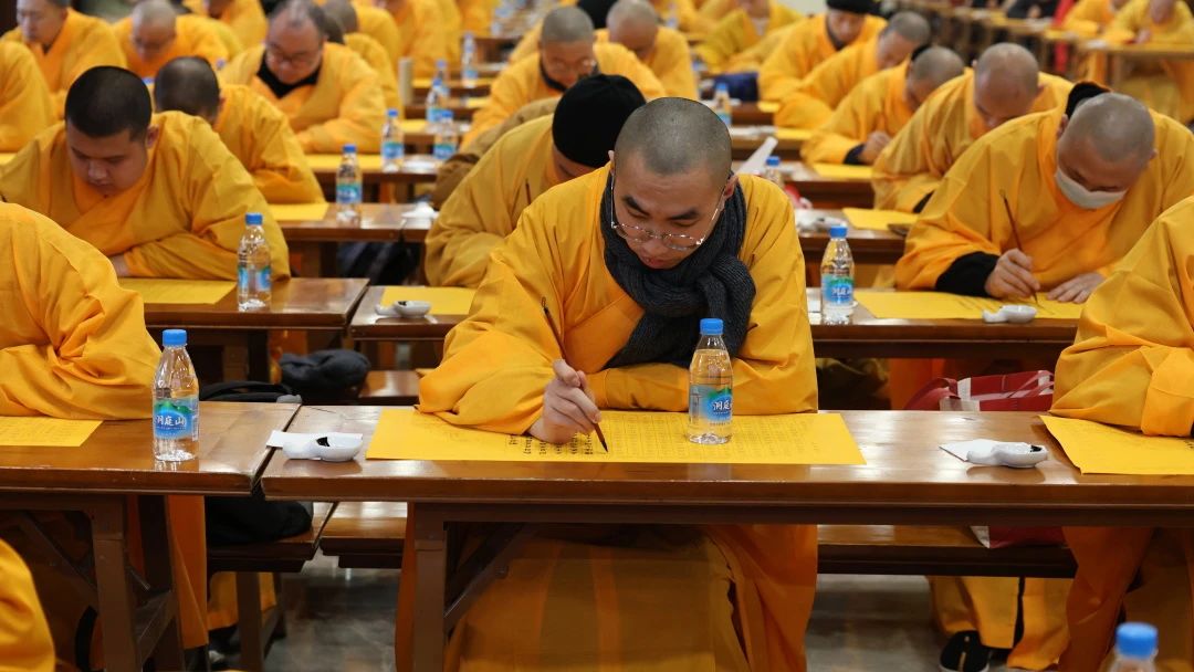 隨著大和尚拈香主法,梵音縈繞,眾人合掌恭誦“無上甚深微妙法,百千萬劫難遭遇。我今見聞得受持,愿解如來真實義。”在這一刻,浮躁與喧囂漸去,心歸于靜,每一位參與者皆以筆為法器,墨為法水,于一筆一劃間,書寫信愿,熏修慧命。