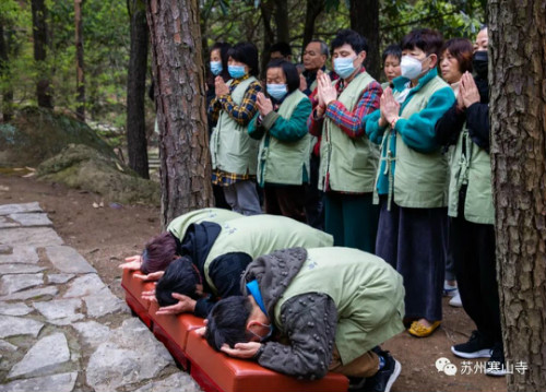 4月3日上午9點(diǎn),四眾弟子前往蘇州天平山為大休上人掃墓。在大休上人墓前擺放鮮花、果品,焚香設(shè)供,上香禮拜。